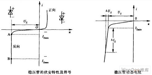 (3)動態電阻rz 它是穩壓管兩端電壓變化與電流變化的比值,如上圖所示,即這個數值隨工作電流的不同而改變。通常工作電流越大,動態電阻越小,穩壓性能越好。